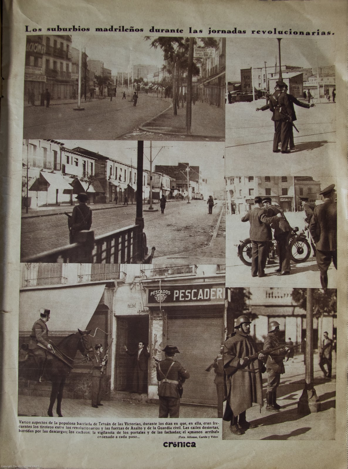 Los "suburbios" madrileños a los que se refiere el artículo son el barrio de Tetuán, donde se sucedían enfrentamientos entre la población y la Guardia de Asalto. A la derecha podemos ver una estampa nacionalista en la que un grupo de gente protesta contra el recién proclamado "Estado Catalán". Imaginamos que al grito de "Yo soy español, español, español....".